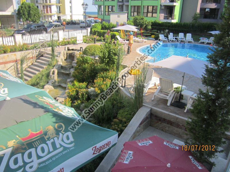 Двустаен апартамент с една спалня с гледка към басейн и морето под наем в целогодишен комплекс Лесо /Lesso/ на тихо място 100 метра от централен плаж в Равда, България. Апартаментът е идеален за целогодишно живеене, летен отдих и и отдаване под наем. Апартаментът се дава за месец, сезон или за година. Цена по договаряне според периода.